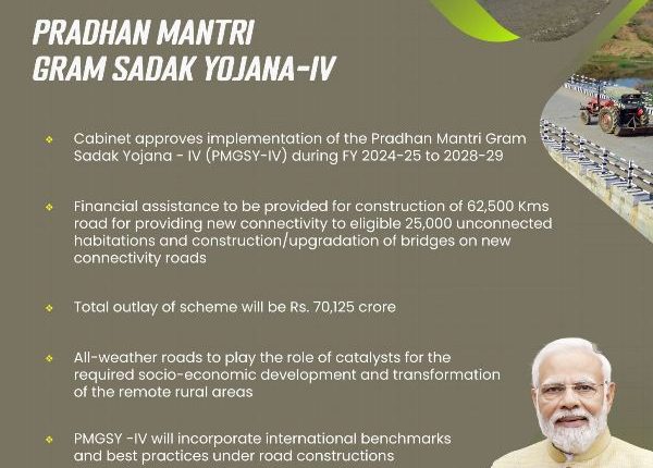 ୨୦୨୪-୨୫ରୁ ୨୦୨୮-୨୯ ଆର୍ଥିକ ବର୍ଷ ମଧ୍ୟରେ ପ୍ରଧାନମନ୍ତ୍ରୀ ଗ୍ରାମ ସଡ଼କ ଯୋଜନା-୪ (ପିଏମ୍ଜିଏସୱାଇ-୪) କାର୍ଯ୍ୟକାରୀ କରିବାକୁ କ୍ୟାବିନେଟ୍ ଅନୁମୋଦନ