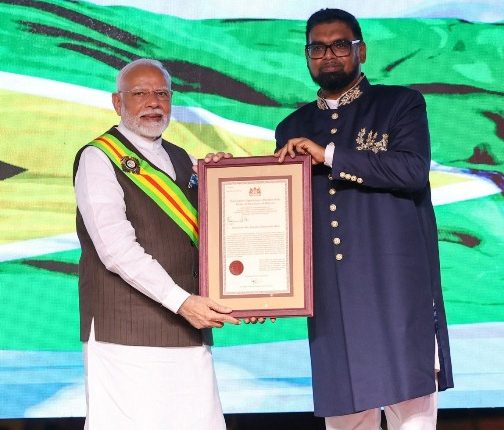 ନୂଆଦିଲ୍ଲୀ, (ପିଆଇବି) : ଗୁୟାନାର ରାଷ୍ଟ୍ରପତି ଆଜି ଷ୍ଟେଟ୍ ହାଉସ୍ରେ ଆୟୋଜିତ ଏକ ସମାରୋହରେ ପ୍ରଧାନମନ୍ତ୍ରୀ ନରେନ୍ଦ୍ର ମୋଦୀଙ୍କୁ ଦେଶର ସର୍ବୋଚ୍ଚ ସମ୍ମାନ ‘ଦ ଅଡର୍ ଅଫ୍ ଏକ୍ସଲେନ୍ସ’ ପ୍ରଦାନ କରିଛନ୍ତି । ଜଣେ ଦୂରଦର୍ଶୀ ରାଜନେତା ରୂପରେ ବିଶ୍ୱ ମଞ୍ଚରେ ବିକାଶଶୀଳ ରାଷ୍ଟ୍ରଙ୍କ ଦାବି ଉଠାଇବା, ବିଶ୍ୱ ସମୁଦାୟ ପାଇଁ ଅତୁଳନୀୟ ସେବା ତଥା ଭାରତ-ଗୁୟାନାର ସମ୍ପର୍କକୁ ସୁଦୃଢ଼ କରିବା ଦିଗରେ ତାଙ୍କର ପ୍ରତିବଦ୍ଧତା ପାଇଁ ତାଙ୍କୁ ଏହି ସମ୍ମାନ ପ୍ରଦାନ କରାଯାଇଛି । ପୁରସ୍କାର ଗ୍ରହଣ କରିବାବେଳେ ପ୍ରଧାନମନ୍ତ୍ରୀ ଏହି ସମ୍ମାନ ଭାରତର ଲୋକମାନଙ୍କୁ ତଥା ଦୁଇ ଦେଶର ଲୋକଙ୍କ ମଧ୍ୟରେ ଥିବା ଗଭୀର ଐତିହାସିକ ସମ୍ପର୍କକୁ ଉତ୍ସର୍ଗ କରିଥିଲେ । ସେ କହିଥିଲେ ଯେ ତାଙ୍କ ଗସ୍ତ ଭାରତ-ଗୁୟାନାର ବନ୍ଧୁତାକୁ ଗଭୀର କରିବା ଦିଗରେ ଭାରତର ନିରନ୍ତର ପ୍ରତିବଦ୍ଧତାର ପ୍ରମାଣ । ଗୁୟାନାର ସର୍ବୋଚ୍ଚ ଜାତୀୟ ସମ୍ମାନ ପାଇବାରେ ପ୍ରଧାନମନ୍ତ୍ରୀ ନରେନ୍ଦ୍ର ମୋଦୀ ଚତୁର୍ଥ ବିଦେଶୀ ନେତା ।
