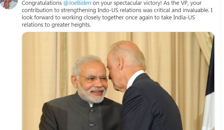 ନୂଆଦିଲ୍ଲୀ : ଆମେରିକାର ନୂତନ ରାଷ୍ଟ୍ରପତି ଜୋ ବାଇଡେନଙ୍କୁ ବିଜୟର ଶୁଭେଚ୍ଛା ଜଣାଇଛନ୍ତି ଭାରତର ପ୍ରଧାନମନ୍ତ୍ରୀ ନରେନ୍ଦ୍ର ମୋଦୀ । ଏଥିସହ ଭାରତୀୟ ମୂଳ ନିବାସୀ କମଳା ହ୍ୟାରିସଙ୍କ ଉପରାଷ୍ଟ୍ରପତି ହୋଇଥିବା ନେଇ ମଧ୍ୟ ଶୁଭେଚ୍ଛା ଜଣାଇଛନ୍ତି । ପ୍ରଧାନମନ୍ତ୍ରୀ ଆଶା କରିଛନ୍ତି ଯେ, ବାଇଡେନ-ହ୍ୟାରିସ ପ୍ରଶାସନ ସହିତ ଭାରତ-ଆମେରିକା ସମ୍ବନ୍ଧ ନୂତନ ଶିଖରକୁ ଛୁଇଁ ପାରିବ ।