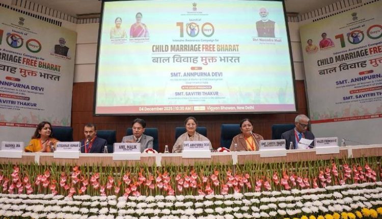 ନୂଆଦିଲ୍ଲୀ, (ପିଆଇବି) : ମହିଳା ଏବଂ ଶିଶୁ ବିକାଶ ମନ୍ତ୍ରଣାଳୟ ଆଜି (4 ଡିସେମ୍ବର 2025) ନୂଆଦିଲ୍ଲୀର ବିଜ୍ଞାନ ଭବନରେ ବାଲ୍ୟ ବିବାହ ମୁକ୍ତ ଭାରତ ଗଠନ ପାଇଁ 100 ଦିନିଆ ସଘନ ସଚେତନତା ଅଭିଯାନ ଆରମ୍ଭ କରିଛି। ବାଲ୍ୟ ବିବାହ ମୁକ୍ତ ଭାରତ ଅଭିଯାନର ପ୍ରଥମ ବାର୍ଷିକୀ ଅବସରରେ ଏହି ଅଭିଯାନ ଆରମ୍ଭ କରାଯାଇଛି । କେନ୍ଦ୍ର ମହିଳା ଏବଂ ଶିଶୁ ବିକାଶ ମନ୍ତ୍ରୀ ଅନ୍ନପୂର୍ଣ୍ଣା ଦେବୀ ଏହି କାର୍ଯ୍ୟକ୍ରମର ଶୁଭାରମ୍ଭ କରିଥିଲେ। ଏହି ଅବସରରେ ମହିଳା ଏବଂ ଶିଶୁ ବିକାଶ ମନ୍ତ୍ରଣାଳୟର ରାଷ୍ଟ୍ରମନ୍ତ୍ରୀ ସାବିତ୍ରୀ ଠାକୁର ଉପସ୍ଥିତ ଥିଲେ ।