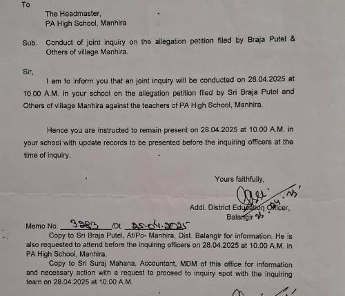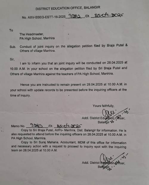 ବଲାଙ୍ଗିର, (ବିମଳେନ୍ଦୁ ସାହୁ) : ସଦର ବ୍ଲକ ଅନ୍ତର୍ଗତ ମନହିରା ସ୍ଥିତ ପଞ୍ଚାୟତ ଆଦିବାସୀ ହାଇସ୍କୁଲରେ ଗତ କିଛି ବର୍ଷ ଧରି ବ୍ୟାପକ ଅନିୟମିତତା ହୋଇ ଆସୁଥିବା ନେଇ ଜିଲ୍ଲାପାଳଙ୍କ ନିକଟରେ ଅଭିଯୋଗ ହୋଇଥିଲା । ତେବେ ଅଭିଯୋଗର ଦୀର୍ଘ ଏକବର୍ଷ ପରେ ମଧ୍ୟ କୌଣସି କାର୍ଯ୍ୟାନୁଷ୍ଠାନ ନିଆଯାଇ ନ ଥିବାରୁ ସ୍ଥାନୀୟ ଅଭିଭାବକ ମହଲରେ ତୀବ୍ର ଅସନ୍ତୋଷ ପ୍ରକାଶ ପାଉଛି । ଅଭିଯୋଗ ମୁତାବକ, ଆଦିବାସୀ ହାଇସ୍କୁଲ, ମନହିରାର ଭାରପ୍ରାପ୍ତ ପ୍ରଧାନଶିକ୍ଷକ ଧର୍ମରାଜ ସାହୁ ଏବଂ ସହକାରୀ ଶିକ୍ଷକ ରାମକୃଷ୍ଣ ଷଡ଼ଙ୍ଗୀ ଦୀର୍ଘବର୍ଷ ଧରି ଏହି ବିଦ୍ୟାଳୟରେ ଆସ୍ଥାନ ଜମାଇ ରହିବା ସହିତ ସ୍କୁଲକୁ ଆସୁଥିବା ସରକାରୀ ଅନୁଦାନର ଦୁରୂପଯୋଗ କରୁଛନ୍ତି । ବିଜ୍ଞାନ ପ୍ରୋତ୍ସାହନ ପୁରସ୍କାର ବାବଦରେ ଛାତ୍ରଛାତ୍ରୀ ପାଇଥିବା ପୁରସ୍କାର ରାଶିରୁ ବେଆଇନ ଭାବେ ଶିକ୍ଷକ ଦ୍ୱୟ ଟଙ୍କା ଅସୁଲ କରିବା, ସ୍କୁଲ ପରିତ୍ୟାଗ ପ୍ରମାଣପତ୍ର ପ୍ରଦାନ ସମୟରେ ଛାତ୍ରଛାତ୍ରୀଙ୍କ ଠାରୁ ଟଙ୍କା ଆଦାୟ, ବିନା ଛୁଟିରେ ଅବୈଧାନିକ ଭାବେ ସ୍କୁଲରେ ଅନୁପସ୍ଥିତ ରହିବା, ଶିକ୍ଷାଦାନ ସମୟରେ ନିରବଚ୍ଛିନ୍ନ ଭାବେ ମୋବାଇଲରେ ଗପିବା, ସ୍କୁଲରେ ଅନୁପସ୍ଥିତ ଛାତ୍ରଛାତ୍ରୀଙ୍କ ଉପସ୍ଥାନ ପକାଇ ସେମାନଙ୍କ ମଧ୍ୟାହ୍ନ ଭୋଜନ ବାବଦ ଅର୍ଥ ଆତ୍ମସାତ କରିବା, ବିଳମ୍ବରେ ବିଦ୍ୟାଳୟକୁ ଆସି ନିର୍ଦ୍ଧାରିତ ସମୟ ଠାରୁ ଆଗତୁରା ସ୍କୁଲ ଛୁଟି କରିବା, ବିଦ୍ୟାଳୟରେ ପୂର୍ବରୁ ଥିବା କାଠର ବେଞ୍ଚ ଓ ଡେସ୍କକୁ ମଧ୍ୟାହ୍ନ ଭୋଜନର ଜାଳେଣି ଭାବେ ବ୍ୟବହାର କରିବା ସହିତ ଛାତ୍ରଛାତ୍ରୀଙ୍କୁ ମାନସିକ ନିର୍ଯ୍ୟାତନା ଦେବା ଭଳି ସଙ୍ଗୀନ ଅଭିଯୋଗ ଆଣି ଅଭିଭାବକମାନେ ଗତବର୍ଷ ଅକ୍ଟୋବର ୨୮ ରେ ବଲାଙ୍ଗିର ଜିଲ୍ଲାପାଳଙ୍କ ଦ୍ୱାରସ୍ଥ ହୋଇଥିଲେ । ଜିଲ୍ଲାପାଳଙ୍କ ନିର୍ଦ୍ଦେଶରେ ଚଳିତ ଏପ୍ରିଲ ୨୮ ରେ ବଲାଙ୍ଗିର ଅତିରିକ୍ତ ଗୋଷ୍ଠୀ ଶିକ୍ଷାଧିକାରୀ ଏହାର ତଦନ୍ତ କରିଥିଲେ ମଧ୍ୟ ଅଦ୍ୟାବଧି କୌଣସି ରିପୋର୍ଟ ଦିଆଯାଇ ନାହିଁ ଅଥବା ଶିକ୍ଷକ ଦ୍ୱୟଙ୍କ ବିରୁଦ୍ଧରେ କୌଣସି ଦୃଷ୍ଟାନ୍ତମୂଳକ କାର୍ଯ୍ୟାନୁଷ୍ଠାନ ଗ୍ରହଣ କରାଯାଇ ନ ଥିବା ଗ୍ରାମବାସୀ ଅଭିଯୋଗ କରିଛନ୍ତି । ଏ ନେଇ ଭାରପ୍ରାପ୍ତ ପ୍ରଧାନ ଶିକ୍ଷକ ଧର୍ମରାଜ ସାହୁ ଏବଂ ସହକାରୀ ଶିକ୍ଷକ ରାମକୃଷ୍ଣ ଷଡ଼ଙ୍ଗୀଙ୍କ ମତାମତ ପାଇଁ ଯୋଗାଯୋଗ କରାଯାଇଥିଲେ ହେଁ ସେମାନଙ୍କ ପ୍ରତିକ୍ରିୟା ମିଳିପାରି ନ ଥିଲା । ଜିଲ୍ଲା ପ୍ରଶାସନ ତଥା ଜିଲ୍ଲା ଶିକ୍ଷା ବିଭାଗ ଏଥିପ୍ରତି ଦୃଷ୍ଟିଦେଇ ଆବଶ୍ୟକ ପଦକ୍ଷେପ ନ ନେଲେ ଆଗାମୀ ଦିନରେ ସ୍କୁଲରେ ତାଲା ପକାଇ ଦିଆଯିବା ସହିତ ଆନ୍ଦୋଳନାତ୍ମକ ପନ୍ଥା ଗ୍ରହଣ କରାଯିବ ବୋଲି ଅଭିଯୋଗକାରୀ ବ୍ରଜ ପୁଟେଲଙ୍କ ସମେତ ସରୋଜ ଭୋଇ, ଗୋବର୍ଦ୍ଧନ ସାହୁ, ବାଲଗୋପାଲ୍ ପୁଟେଲ, ବଂଶୀଧର ଭୋଇ, ସୁରୁ ଭୋଇ, ବୈଶାଖୁ ପୋଢ଼, ତେଜ ମଟାରି, ଜଗନ୍ନାଥ ମରପାଚି, ଅନାଦି ବଗର୍ତ୍ତିଙ୍କ ସମେତ ଗ୍ରାମବାସୀ ଚେତାବନୀ ଦେଇଛନ୍ତି ।