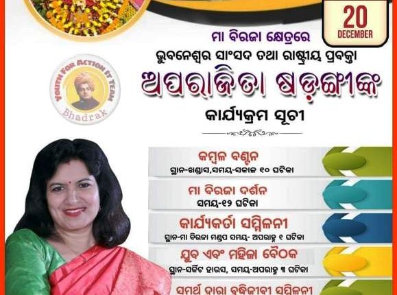 ଯାଜପୁର : ଆଜି ମା’ ବିରଜାଙ୍କୁ ଦର୍ଶନ ପାଇଁ ଯାଜପୁର ଆସିଛନ୍ତି ଭୁବନେଶ୍ୱର ସାଂସଦ, ରାଜ୍ୟ ଉପସଭାପତି ତଥା ରାଷ୍ଟ୍ରୀୟ ପ୍ରବକ୍ତା ଅପରାଜିତା ଷଡ଼ଙ୍ଗୀ । ଏହି ଅବସରରେ କେତକ ରାଜନୈତିକ ଏବଂ ସାମଜିକ ସଂଗଠନର କାର୍ୟ୍ୟକ୍ରମରେ ଯୋଗ ଦେବା ସହ ବିଭିନ୍ନ ବିଷୟ ନେଇ ପ୍ରେସ ବାର୍ତ୍ତା ପ୍ରଦାନ କରିବାର କାର୍ଯ୍ୟକ୍ରମ ରହିଛି ।