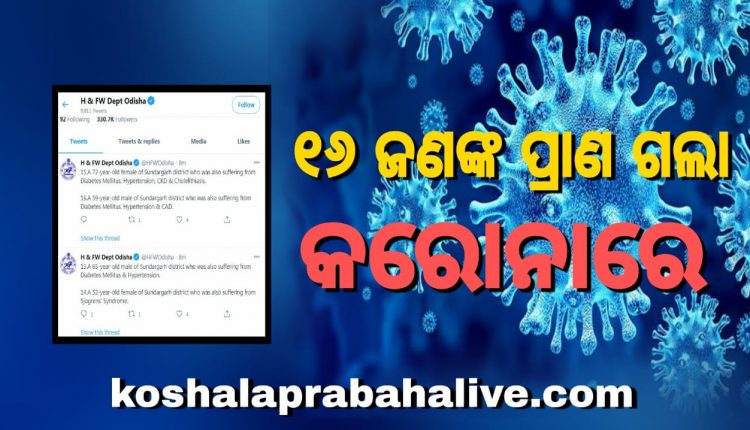 ଭୁବନେଶ୍ୱର, (କେପିଏନ୍ଏସ୍) : ଯଦିବି ରାଜ୍ୟରେ କରୋନା ସଂକ୍ରମଣ କମିଛି, ତଥାପି ପ୍ରତ୍ୟହ ମୃତ୍ୟୁ ସଂଖ୍ୟା କମୁ ନଥିବାର ଲକ୍ଷ୍ୟ କରାଯାଇଛି । ଆଜି ପୁଣି ୧୬ ଜଣଙ୍କ ପ୍ରାଣ ନେଇଛି କରୋନା ବୋଲି ରାଜ୍ୟ ସ୍ୱାସ୍ଥ୍ୟ ଓ ପରିବାର କଲ୍ୟାଣ ମନ୍ତ୍ରଣାଳୟ ପକ୍ଷରୁ କୁହାଯାଇଛି । ସୂଚନା ଅନୁସାରେ ସୁନ୍ଦରଗଡ଼ ଜିଲ୍ଲାରେ ୪, ପୁରୀ ଜିଲ୍ଲାରେ ୩ ଏବଂ ଖୋର୍ଦ୍ଧା, କଟକ, ଢେଙ୍କାନାଲ, ଯାଜପୁର, ଗଂଜାମ, ଭଦ୍ରକ, ଭୁବନେଶ୍ୱର, ଅନଗୁଳ ଓ ବରଗଡ଼ରୁ ଜଣେ ଲେଖାଏଁ କରୋନା ଯୋଗୁଁ ମୃତ୍ୟୁବରଣ କରିଥିବା ସୂଚନା ପ୍ରଦାନ କରାଯାଇଛି ।