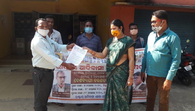 ସଇଁନ୍ତଲା, (ପ୍ରଶାନ୍ତ କୁମାର ମେହେର) : ବଲାଙ୍ଗିର ଜିଲ୍ଲା ସଇଁନ୍ତଲା ତହସିଲ ଠାରେ ରାଷ୍ଟ୍ରୀୟ ଆଦିବାସୀ ଏକତା ପରିଷଦ, ବଲାଙ୍ଗିର ଜିଲ୍ଲା ସଇଁନ୍ତଲା ବ୍ଲକ ଶାଖା ତରଫରୁ ଆଦିବାସୀଙ୍କ ଜଙ୍ଗଲ, ଜମି, ଆଦିବାସୀଙ୍କୁ ହିନ୍ଦୁକରଣ ବନ୍ଦ କରିବା, ୫ମ ଅନୁଛେଦ ଲାଗୁ କରିବା, ଆଗାମୀ ଜନଗଣନାରେ ଆଦିବାସୀଙ୍କ ପାଇଁ ଅଲଗା ଧର୍ମ କୋଡ ବ୍ୟବହାର କରିବା ଇତ୍ୟାଦି ୧୮ ଦଫା ଦାବୀ ନେଇ ରାଷ୍ଟ୍ରପତିଙ୍କ ଉଦ୍ଦେଶ୍ୟରେ ତହସିଲଦାରଙ୍କ ଅନୁପସ୍ଥିତିରେ ବରିଷ୍ଠ କିରାଣୀଙ୍କୁ ପ୍ରଦାନ କରଯାଇଥିଲା । ଏଥିରେ ବଲାଙ୍ଗିର ଜିଲ୍ଲା ରାଷ୍ଟ୍ରୀୟ ଆଦିବାସୀ ଏକତା ପରିଷଦ ସଭାପତି ଖୁସିରାମ ଜାନି, ରାଜିନ୍ଦ୍ର ଭୋଇ, ଛାତ୍ର ସଂଘ ସଭାପତି ସୁଶାନ୍ତ ଭୋଇ, ବେରୋଜଗାର ମୋର୍ଚ୍ଚା ସଭାପତି ବାସୁଦେବ ପ୍ରଧାନୀ ଓ ଅନ୍ୟମାନେ ଉପସ୍ଥିତ ରହିଥିଲେ ।