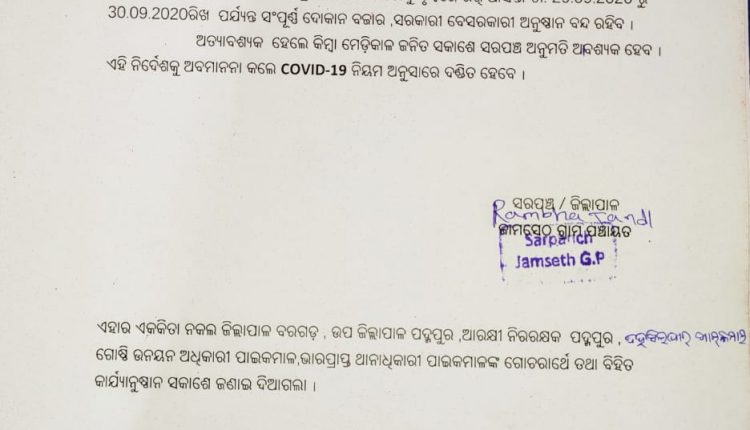 ପଦ୍ମପୁର, (ନିରୋଜ କୁମାର ପାଣୀ) : କରୋନା ସଂକ୍ରମଣ ବୃଦ୍ଧିକୁ ଦୃଷ୍ଟିରେ ରଖି ପାଇକମାଲ ପଞ୍ଚାୟତ ସମିତି ଅଧୀନସ୍ଥ ଜାମସେଠ ଗ୍ରାମ ପଞ୍ଚାୟତକୁ ଆସନ୍ତା କାଲି ୨୯/୯/୨୦ ରୁ ତା ୩୦/୯/୨୦ ଦୁଇ ଦିନ ସଟ ଡାଉନ କରାଯିବ। ଏହି ଦୁଇ ଦିନ ଧରି ସଟ ଡାଉନରେ ଜରୁରୀକାଳୀନ ସେବାକୁ ବାଦ୍ ଦେଇ ବାକି ସଂପୂର୍ଣ୍ଣ ଦୋକାନ ବଜାର, ସରକାରୀ ଓ ବେସରକାରୀ ଅନୁଷ୍ଠାନ ବନ୍ଦ କରାଯିବ ବୋଲି ଜାମସେଠ ଗ୍ରାମ ପଞ୍ଚାୟତ ସରପଞ୍ଚ ଶ୍ରୀମତୀ ରମ୍ଭା ତାଣ୍ତି ସୂଚନା ଦେଇଛନ୍ତି ।