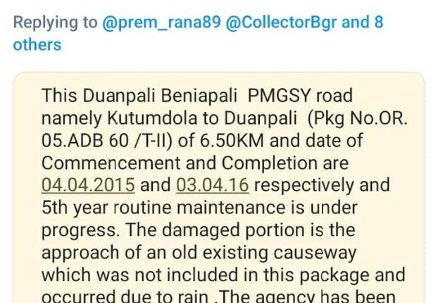ଚୁଡାପାଲି, (ରାଜେଶ ଦଣ୍ଡସେନା) : ଗତ ୨୫ ତାରିଖରେ ‘କୋଶଳ ପ୍ରବାହ’ ପୋର୍ଟାଲ୍ରେ ଦୁଆନପାଲିରୁ ବେନିଆପାଲି ସେତୁ ମୁଣ୍ଡର ରାସ୍ତାରେ ଖାଲ ରହିଥିବା ଖବର ପ୍ରକାଶ ପାଇଥିଲା । ସେହି ସମସ୍ୟା ଭିତ୍ତିକ ଖବରକୁ ସମାଜସେବୀ ପ୍ରେମ ରଣା ଦେଖି ଜିଲ୍ଲା ପ୍ରଶାସନ ତଥା ମୁଖ୍ୟମନ୍ତ୍ରୀଙ୍କ କାର୍ୟ୍ୟାଳୟକୁ ଟ୍ୱିଟର ଯୋଗେ ଅଭିଯୋଗ କରିଥିଲେ । ତାଙ୍କ ଅଭିଯୋଗ ପାଇବା ପରେ ଗ୍ରାମ ଉନ୍ନୟନ ବିଭାଗ ତତ୍ପରତା ଦେଖାଇ ରାସ୍ତା ମରାମତି କାମ ତୁରନ୍ତ କରାଯିବ ବୋଲି ପ୍ରତିଶ୍ର୍ରୁତି ଦେଇଛନ୍ତି । ତାଙ୍କ ପ୍ରତିଶ୍ର୍ରୁତି ପାଇବା ପରେ ଅଞ୍ଚଳର ଜନସାଧାରଣଙ୍କ ଖୁସି କହିଲେ ନ ସରେ । ଆଗକୁ ତାଙ୍କ ପ୍ରତିଶ୍ର୍ରୁତି ରଖିବେ ବୋଲି ଜନସାଧାରଣ ଆଶା ରଖିଛନ୍ତି ।