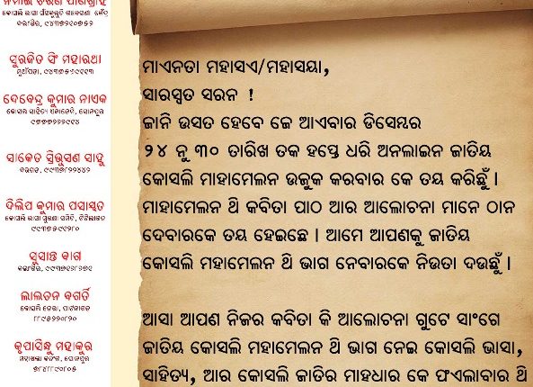 ଟିଟିଲାଗଡ଼, (ଗୌରବ ଦର୍ଜୀ) : ଜାତୀୟ କୋଶଲୀ ମହାମେଲନ୍‌ ଆସନ୍ତା ୨୪ରୁ ୩୦ ତାରିଖ ପର୍ଯ୍ୟନ୍ତ ଅନୁଷ୍ଠିତ ହେବ ବୋଲି ଜାତୀୟ କୋଶଲୀ ମହାମେଲନ୍‌ କମିଟି ପକ୍ଷରୁ କୁହାଯାଇଛି । ତେବେ କୋଭିଡ-୧୯ କଟକଣାକୁ ଦୃଷ୍ଟିରେ ରଖି ଏହି କାର୍ଯ୍ୟକ୍ରମ ଅନ୍‌ଲାଇନ୍‌ ମାଧ୍ୟମରେ ଅନୁଷ୍ଠିତ ହେବ ବୋଲି ସୂଚନା ଦିଆଯାଇଛି । ଏହି ଅବସରରେ କବିତା ପାଠ ତଥା ଆଲୋଚନା ଚକ୍ର ପ୍ରତ୍ୟହ ନିୟମିତ ଭାବରେ ଅନୁଷ୍ଠିତ ହେବ । ତେବେ ଏହି କାର୍ଯ୍ୟକ୍ରମ ଗୁଡ଼ିକରେ ସାମିଲ୍‌ ହେବା ପାଇଁ କୋଶଲ ଅଂଚଳର କବି, ଲେଖକ, ସାହିତ୍ୟିକମାନଙ୍କୁ କମିଟି ପକ୍ଷରୁ ଆମନ୍ତ୍ରଣ କରାଯାଇଥିବା ବେଳେ କୋଶଲବାସୀଙ୍କ ସହଯୋଗ ହେଲେ କୋଶଲୀ ଭାଷାର ସମୂହ ସମୃଦ୍ଧି ସାଧନ ହୋଇପାରିବ ବୋଲି ଆଶା କରାଯାଇଛି ।