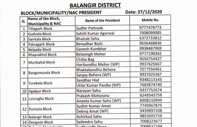 ବଲାଙ୍ଗିର, (କେପିଏନ୍ଏସ୍) : ଆଜି ବିଜୁ ଜନତା ଦଳର ସଭାପତି ଶ୍ରୀଯୁକ୍ତ ନବୀନ ପଟ୍ଟନାୟକଙ୍କ ଅନୁମୋଦନ କ୍ରମେ ଦଳର ଛାମୁଆ ଯୁବ ସଂଗଠନକୁ ସୁଦୃଢ ଓ କ୍ରିୟାଶୀଳ କରିବା ପାଇଁ ବିଜୁ ଯୁବ ଜନତା ଦଳର ସାଧାରଣ ସମ୍ପାଦକ (ଯୁବ ବ୍ୟାପାର) ଶ୍ରୀଯୁକ୍ତ ପ୍ରଣବ କୁମାର ବଳବନ୍ତରାୟ ଏବଂ ବିଜୁ ଯୁବ ଜନତା ଦଳର ସଭାପତି ଡ଼ଃ ବ୍ୟୋମକେଶ ରାୟଙ୍କ ଦ୍ୱାରା ବଲାଙ୍ଗିର ଜିଲ୍ଲାର ବ୍ଲକ, ଏନ୍ଏସି ଓ ମ୍ୟୁନିସିପାଲିଟି ସଭାପତିଙ୍କ ନାମ ଘୋଷଣା କରାଯାଇଛି । ଏହି ନୂତନ କମିଟି ଫଳରେ ଯୁବ ସମାଜର ରାଜନୈତିକ କ୍ରିୟାଶୀଳତାରେ ବିଶେଷ ବୃଦ୍ଧି ପାଇବ ବୋଲି ଆଶା କରାଯାଇଛି । । ଟିଟିଲାଗଡ ବ୍ଲକରୁ ସୁଧୀର ପଟ୍ଟନାୟକ, ଗୁଡଭେଲା ବ୍ଲକରୁ ସତୀଶ କୁମାର ଅଗ୍ରୱାଲ, ସଇଁନ୍ତଲା ବ୍ଲକରୁ ଭୈରବ ସାହୁ, ପାଟଣାଗଡ ବ୍ଲକରୁ ବେଣୁଧର ବିଶି,ବେଳପଡା ବ୍ଳକରୁ ଗଣେଶ କୁମ୍ଭାର, ଖପ୍ରାଖୋଲ ବ୍ଲକରୁ ବେଳସିଂ ମେହେର, ମୁରୀବାହାଲ ବ୍ଳକରୁ ଚି୍ତ୍ତ ବାଗ ଏବଂ ହରୀବନ୍ଧୁ ମେହେର ବୋଙ୍ଗମୁଣ୍ଡା ବ୍ଲକରୁ ଭକ୍ତବନ୍ଧୁ ବେହେରା ଏବଂ ସଂଜୟ ବେହେରା, ତୁରେକଲା ବ୍ଲକରୁ ସସୀଧର ହିଆଲ ଏବଂ ଉ୍ତ୍ତର କୁମାର ପନିକ, ଆଗଲପୁର ବ୍ଳକରୁ ନାରାୟାଣ ସାହୁ, ଲୋଇସିଂହା ବ୍ଲକରୁ ପ୍ରକାଶ ମହାରଣା ଏବଂ ଅନନ୍ତ କୁମାର ସାହୁ, ପୁଇଁନ୍ତଲା ବ୍ଲକରୁ ସୁଧୀର କୁମାର ଅମାତ ଏବଂ ଦେବରାଜ ଅମାତ, ବଲାଙ୍ଗିର ବ୍ଲକରୁ ଆର୍ଶିବାଦ ସାହୁ , ଦେଓଗାଁ ବ୍ଲକରୁ ସୈଲେନ୍ଦ୍ର ସାହୁ, ବଲାଙ୍ଗିର ମ୍ୟୁନିସିପାଲିଟିରୁ ସୁଧନିଧୀ ଦୀପ୍, ଟିଟିଲାଗଡ ଏନ୍ଏସିରୁ ରାଜୁ ସିଂ ପାତ୍ର, ତୁସୁରା ଏନ୍ଏସିରୁ ଅଜୟ ଜୈସ୍ୱାଲ୍, ପାଟଣାଗଡ ଏନ୍ଏସିରୁ ପରେଶ କୁମାର ସାହୁ, ଏବଂ କଣ୍ଟାବାଞ୍ଚି ଏନ୍ଏସିରୁ ବିଷ୍ଣୁପ୍ରସାଦ ଜୁଏଡ୍ ଏବଂ ବିଶାଲ ବେହେରା ଏମାନଙ୍କୁ ନୂତନ ସଭାପତି ଭାବେ ଦଳ ପକ୍ଷରୁ ଘୋଷଣା କରାଯାଇଛି ।