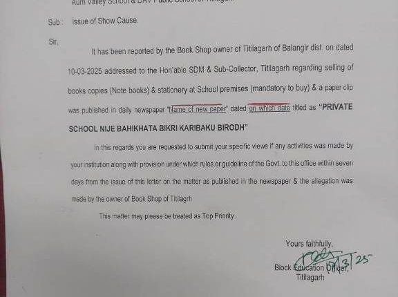 ଟିଟିଲାଗଡ଼ ବ୍ଲକ ଶିକ୍ଷା ଅଧିକାରୀଙ୍କ କାର୍ଯ୍ୟାଳୟ : ସହରର ପ୍ରାଇଭେଟ୍ ସ୍କୁଲକୁ ଦେଲେ ସୋ କଜ ନୋଟିସ
