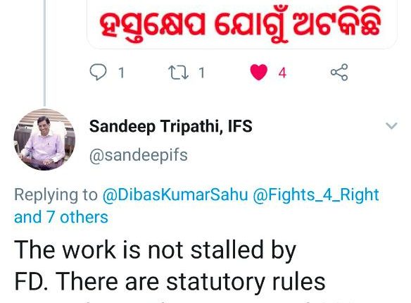 ବରଗଡ ଜିଲ୍ଲା ପଦ୍ମପୁର ଉପଖଣ୍ଡ ଅନ୍ତର୍ଗତ ରାଜବୋଡାସମ୍ବର ବ୍ଲକ ଅଧୀନସ୍ଥ ବୁଡାମାଲ ଠାରୁ ଦହିତା ଗ୍ରାମର ରାସ୍ତା ଦୁରାବସ୍ଥା ବାବଦରେ ଗତକାଲି ‘କୋଶଳ ପ୍ରବାହ’ରେ ଖବର ପ୍ରସାରିତ ହୋଇଥିଲା, ଯାହାକୁ ପଢ଼ି ବରଗଡ଼ ଜିଲ୍ଲା ବିଜେପୁର ବ୍ଲକର ଜଣେ ସଚେତନ ସ୍ୱେଚ୍ଛାସେବୀ ଦିବସ କୁମାର ସାହୁ ମୁଖ୍ୟମନ୍ତ୍ରୀଙ୍କ କାର୍ଯ୍ୟାଳୟକୁ ଟ୍ୱିଟର ମାଧ୍ୟମରେ ଅଭିଯୋଗ କରିଥିଲେ । ଏହି ଟ୍ୱିଟ୍ କୁ ଗୁରୁତ୍ୱ ଦେଇ ଓଡ଼ିଶା ସରକାରଙ୍କ ବିଭାଗ ମୁଖ୍ୟ ସଂରକ୍ଷଣକାରୀ ସନ୍ଦୀପ ତ୍ରିପାଠୀ ତାଙ୍କର ପ୍ରତ୍ୟୁତ୍ତର ରଖିଥିଲେ ଯେ ଏହି ରାସ୍ତା ଜଙ୍ଗଲ ବିଭାଗ ଦ୍ଵାରା ବନ୍ଦ କରାଯାଇନାହିଁ । ରାସ୍ତା ନିର୍ମାଣ ନିମନ୍ତେ ସେଠାରେ ଆଇନଗତ ନିୟମ ପ୍ରଣାଳୀ ଅଛି । ସଂପୃକ୍ତ ୩୦୦ ମିଟର ହେଉଛି ଏକ ଗ୍ରାମ୍ୟ ଜଙ୍ଗଲ ଏବଂ ଏହାକୁ ଏଫଆରଏ ଅଧୀନରେ ସ୍ଥାନାନ୍ତର କରିବା ଆବଶ୍ୟକ ଅଛି । ଦୁଇ ଦିନ ପୂର୍ବରୁ ପ୍ରଧାନମନ୍ତ୍ରୀ ଗ୍ରାମ୍ୟ ସଡକ ନିର୍ମାଣ ପାଇଁ ଆବେଦନ ନିମନ୍ତେ ଗ୍ରାମ୍ୟ ଉନ୍ନୟନ ବିଭାଗ ଫର୍ମ ଗ୍ରହଣ କରିଛି ଏବଂ ଏପର୍ଯ୍ୟନ୍ତ ଅପେକ୍ଷା ରହିଛି । ବରଗଡ଼ ଜିଲ୍ଲା ଡିଏଫଓ.ଙ୍କ ଅନୁଯାୟୀ ରାସ୍ତା ନିର୍ମାଣ ପାଇଁ ତୁରନ୍ତ ପ୍ରକ୍ରିୟାକରଣ କରାଯିବ ବୋଲି ଶ୍ରୀ ତ୍ରିପାଠୀ ତାଙ୍କ ଟ୍ୱିଟରେ ଉଲ୍ଲେଖ କରିଛନ୍ତି ।