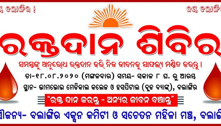 ବଲାଙ୍ଗିର, (କେପିଏନ୍ଏସ୍) : ବଲାଙ୍ଗିର ଭୀମ ଭୋଇ ମେଡିକାଲ କଲେଜ ଓ ହସପିଟାଲ ରକ୍ତ ଭଣ୍ଡାରରେ ରକ୍ତର ଅଭାବକୁ ଦୃଷ୍ଟିରେ ରଖି ବଲାଙ୍ଗୀର ଏକ୍ସନ କମିଟୀ ଓ ସଚେତନା ମହିଳା ମଂଚ ପକ୍ଷରୁ ଆସନ୍ତା କାଲି ଅର୍ଥାତ ୧୮ ତାରିଖ ଦିନ ସକାଳ ୮ଟା ସମୟରେ ରକ୍ତଦାନ ଶିବିର ଅନୁଷ୍ଠିତ ହେବାକୁ ଯାଉଛି । ତେଣୁ ସମସ୍ତ ସ୍ୱେଚ୍ଛାକୃତ ରକ୍ତଦାତା ଉପସ୍ଥିତ ରହି ସହଯୋଗ କରିବାକୁ ଅନୁରୋଧ କରାଯାଇଛି ।