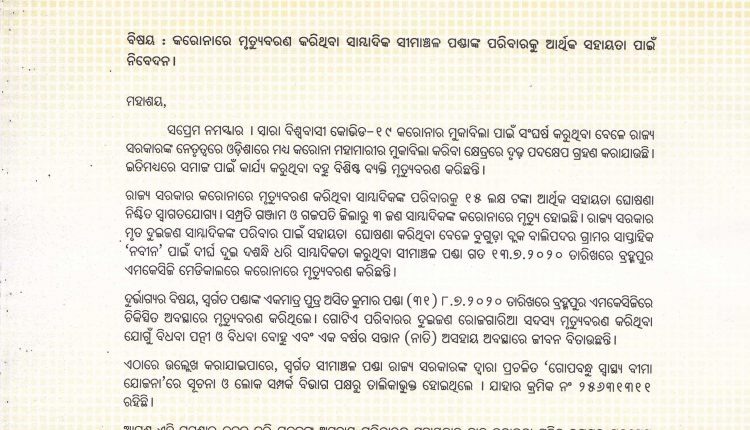 ଦୁଃଖଦ ବିଷୟ, ସ୍ୱର୍ଗତ ପଣ୍ଡା ଗତ ଜୁଲାଇ ୧୩ ତାରିଖରେ ମୃତ୍ୟୁବରଣ କରିଥିବା ବେଳେ ୮ ତାରିଖରେ ତାଙ୍କର ଏକମାତ୍ର ପୁତ୍ର ଅସିତ କୁମାର ପଣ୍ଡା ୩୧ ବର୍ଷ ବୟସରେ କରୋନା ଲକ୍ଷଣ ଦେଖାଯିବା ଯୋଗୁଁ ଚିକିତ୍ସା ପାଇଁ ନେବା ବେଳେ ମୃତୁ୍ୟବରଣ କରିଛନ୍ତି । ସ୍ୱର୍ଗତ ପଣ୍ଡାଙ୍କ ବିଧବା ପତ୍ନୀ, ବିଧବା ବୋହୁ ଓ ଏକ ବର୍ଷର ନାତି ନିଃସହାୟ ଅବସ୍ଥାରେ କାଳାତିପାତ କରୁଛନ୍ତି । ସ୍ୱର୍ଗତ ପଣ୍ଡା ରାଜ୍ୟ ସରକାରଙ୍କ ଗୋପବନ୍ଧୁ ସ୍ୱାସ୍ଥ୍ୟ ବୀମା ଯୋଜନାରେ ଅନ୍ତର୍ଭୁକ୍ତ ଥିଲେ । ଗତ ଦୁଇ ଦଶନ୍ଧି ଧରି ରାଜ୍ୟ ସରକାରଙ୍କ ଦ୍ୱାରା ଅନୁମୋଦନପ୍ରାପ୍ତ ସାପ୍ତାହୀକ “ନବୀନ’ର ପ୍ରତିନିଧି ଭାବେ କାର୍ଯ୍ୟ କରି ଆସୁଥିଲେ । ତେଣୁ ଏ ଦିଗରେ ସରକାର ତୁରନ୍ତ ଦୃଷ୍ଟି ଦେଇ ପଦକ୍ଷେପ ଗ୍ରହଣ କରିବା ସହ ମୃତକଙ୍କ ଅସହାୟ ପରିବାରକୁ ସହାୟତା ପ୍ରଦାନ କରିବାକୁ ଶ୍ରୀ ରଥ ନିବେଦନ କରିଛନ୍ତି ।