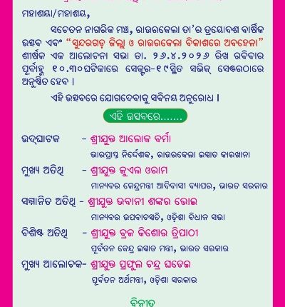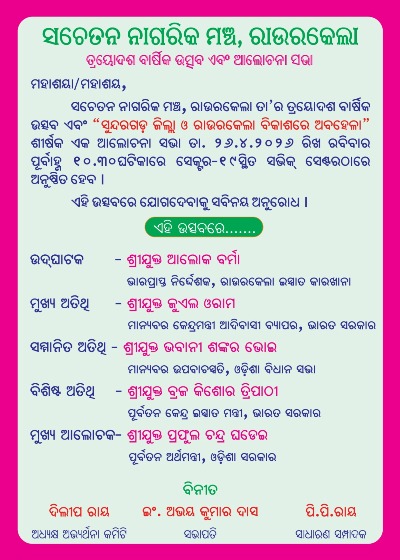 ରାଉରକେଲା, (ସସ୍ମିତା ପ୍ରଧାନ) : ସହରର ଅନ୍ୟତମ ସାମାଜିକ ଅନୁଷ୍ଠାନ ରାଉରକେଲା ସଚେତନ ନାଗରିକ ମଞ୍ଚର ତ୍ରୟୋଦଶ ବାର୍ଷିକ ଉତ୍ସବ ଓ ଆଲୋଚନାସଭା ସ୍ଥାନୀୟ ସିଭିକ୍ ସେଣ୍ଟର ଠାରେ ଚଳିତ ମାସ ୨୬ ତାରିଖ ରବିବାର ପୂର୍ବାହ୍ନ ୧୦ ଘଟିକା ସମୟରେ ପାଳନ କରାଯିବ । ଏହି ପରିପ୍ରେକ୍ଷୀରେ ‘ସୁନ୍ଦରଗଡ ଜିଲ୍ଲା ଓ ରାଉରକେଲା ବିକାଶରେ ଅବହେଳା’ ଶୀର୍ଷକ ଏକ ଆଲୋଚନା ଚକ୍ର ଅନୁଷ୍ଠିତ ହେବ । ଉକ୍ତ କାର୍ଯ୍ୟକ୍ରମରେ କେନ୍ଦ୍ର ଆଦିବାସୀ ବ୍ୟାପାର ମନ୍ତ୍ରୀ ଜୁଏଲ ଓରାମ ମୁଖ୍ୟଅତିଥି, ଓଡ଼ିଶା ବିଧାନ ସଭାର ଉପ ବାଚସ୍ପତି ଭବାନୀ ଶଙ୍କର ଭୋଇ ସମ୍ମାନିତ ଅତିଥି, ରାଉରକେଲା ଇସ୍ପାତ କାରଖାନାର ଭାରପ୍ରାପ୍ତ ନିର୍ଦ୍ଦେଶକ ଆଲୋକ ବର୍ମା ଉଦଘାଟକ, ପୂର୍ବତନ କେନ୍ଦ୍ର ଇସ୍ପାତ ମନ୍ତ୍ରୀ ବ୍ରଜ କିଶୋର ତ୍ରିପାଠୀ ବିଶିଷ୍ଟ ଅତିଥି ଏବଂ ଓଡ଼ିଶାର ପୂର୍ବତନ ଅର୍ଥମନ୍ତ୍ରୀ ପ୍ରଫୁଲ୍ଲ ଚନ୍ଦ୍ର ଘଡ଼େଇ ମୁଖ୍ୟ ଆଲୋଚକ ଭାବେ ଯୋଗଦେବାର କାର୍ଯ୍ୟକ୍ରମ ରହିଛି । ଏହି ଅବସରରେ ସ୍ମରଣିକା ଉନ୍ମୋଚନ ସହ ସମ୍ବର୍ଦ୍ଧିତ କାର୍ଯ୍ୟକ୍ରମ ରହିଛି । ଏହି କାର୍ଯ୍ୟକ୍ରମରେ ବହୁ ସଂଖ୍ୟାରେ ଜନସାଧାରଣ ଯୋଗ ଦେବା ପାଇଁ ମଞ୍ଚର ସଭାପତି ଅଭୟ କୁମାର ଦାସ ଏବଂ ସାଧାରଣ ସଂପାଦକ ପି.ପି. ରାୟ ନିବେଦନ କରିଛନ୍ତି ।