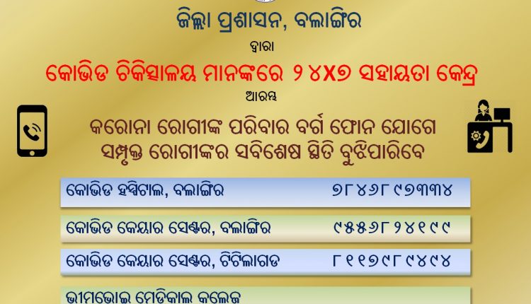 ବଲାଙ୍ଗିର, (କେପିଏନ୍ଏସ୍) : ବଲାଙ୍ଗିର ଜିଲ୍ଲା ପ୍ରଶାସନ ପକ୍ଷରୁ କୋଭିଡ୍ ଚିକିତ୍ସାଳୟମାନଙ୍କରେ ୨୪X୭ ସହାୟତା କେନ୍ଦ୍ର ଆରମ୍ଭ କରାଯାଇଛି । ତେବେ କରୋନା ରୋଗୀଙ୍କ ପରିବାର ବର୍ଗ ଫୋନ୍ ଯୋଗେ ସଂପୃକ୍ତ ରୋଗୀଙ୍କର ସବିଶେଷ ସ୍ଥିତି ବୁଝିବା ପାଇଁ ଏହି ସୁଯୋଗ ସୃଷ୍ଟି କରାଯାଇଥିବା କୁହାଯାଇଛି । କୋଭିଡ୍ ହସ୍ପିଟାଲ, ବଲାଙ୍ଗିର ପାଇଁ ମୋବାଇଲ୍ ନଂ.୭୮୪୬୮୯୭୩୩୪, କୋଭିଡ୍ କେୟାର ସେଣ୍ଟର, ବଲାଙ୍ଗିର ପାଇଁ ମୋବାଇଲ୍ ନଂ.୯୫୫୬୮୨୪୧୯୯, କୋଭିଡ୍ କେୟାର ସେଣ୍ଟର, ଟିଟିଲାଗଡ଼ ପାଇଁ ମୋବାଇଲ୍ ନଂ.୮୧୧୭୯୮୯୪୯୪ ଏବଂ ଭୀମ ଭୋଇ ମେଡ଼ିକାଲ କଲେଜ ଓ ହସ୍ପିଟାଲ୍, ବଲାଙ୍ଗିର (ଆଇସିୟୁ/ଏଚ୍ଡିୟୁ/ୱାର୍ଡ) ପାଇଁ ମୋବାଇଲ୍ ନଂ.୮୪୮୦୬୪୩୧୬୭ ।