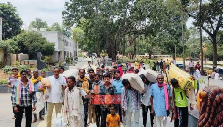ପଦ୍ମପୁର, (ନିରୋଜ କୁମାର ପାଣୀ) : ପଦ୍ମପୁର ଉପଖଣ୍ଡ ପାଇକମାଲ ବ୍ଲକ ଝିଟିକି ଗ୍ରାମରୁ ପ୍ରତି ବର୍ଷ ପରି ଚଳିତ ବର୍ଷ ନୁଆଁଖାଇ ପାଇଁ ପଶ୍ଚିମ ଓଡ଼ିଶାର ପ୍ରସିଦ୍ଧ ତୀର୍ଥକ୍ଷେତ୍ର ନୃସିଂହନାଥ ମନ୍ଦିରକୁ ଆସିଲା ସାଲିଆନା ଭାର । ଝିଟିକି ଗ୍ରାମର ଚାଷୀମାନଙ୍କ ସହ ସମଗ୍ର ଗ୍ରାମବାସୀ ପ୍ରାୟ ୩୦୦ ପରିବାର ଗାଁରେ ଘର ଘର ବୁଲି ସଂଗ୍ରହ କରି ଥିଲେ ନୁଆଁଖାଇ ସାମଗ୍ରୀ । ବୁଧବାର ପ୍ରାୟ ୪୦ ଜଣ ଗ୍ରାମବାସୀ ଚାଉଳ ୨ କୁଇଣ୍ଟାଲ ୫୧ କେଜି, ମୁଗ ସାଢେ ୫ କେଜି, ଘିଅ ୧ କେଜି, ଗୁଡ ୨ କେଜି, ଲୁଣ ୫ କେଜି ମାଖନ ୧୦ ଗୋଟି, ନଡ଼ିଆ ୫ଗୋଟି ଓ ଅନ୍ୟପନି ପରିବା ସହ ଅଙ୍ଗୁର କଦଳୀ ଭାରରେ ଆଣି ନୃସିଂହନାଥ ମନ୍ଦିରର ଭଣ୍ତାର ମହୁରୀ ସତ୍ୟ ପୁରୋହିତ ତଥା ମନ୍ଦିର କାର୍ଯ୍ୟନିର୍ବାହୀ ଅଧିକାରୀ ପୁରୁଷୋତ୍ତମ ପ୍ରଧାନଙ୍କ ପାଖରେ ଜମା ଦେଇଛନ୍ତି । ହରି ଧରୁଆ, ମେନେଜର ଧରୁଆ, ବ୍ରହ୍ମ ଧରୁଆ, ଅପିଁନ ଭୋଇ ପ୍ରମୁଖଙ୍କ ସହ ୪୦ ଜଣ ଗ୍ରାମବାସୀ ସାଲିଆନା ଭାର ସହ ଆସିଥିଲେ । ସେମାନେ ସମସ୍ତେ ନୃସିଂହ ମହାପ୍ରଭୁଙ୍କୁ ଦର୍ଶନ କରି ଅନ୍ନ ପ୍ରସାଦ ଖାଇ ଖୁସିରେ ଘରକୁ ଫେରିଥିଲେ । ହରି ଧରୁଆଙ୍କୁ ଏନେଇ ପଚାରିବାରୁ ଆମେ ଆଣୁଥିବା ଜିନିଷ ନୂଆଖାଇ ଦିନ ଠାକୁରଙ୍କ ଠାରେ ଭୋଗ ଲଗାଯାଇ ଭକ୍ତ ମାନଙ୍କୁ ଅର୍ଣ୍ଣ ପ୍ରସାଦ ବଣ୍ଟା ଯାଉଥିବାରୁ ପ୍ରତିବର୍ଷ ଆମେ ସାଲିଆନା ଭାର ମନ୍ଦିରକୁ ଆଣିଥାଉ ବୋଲି ସେ କହିଥିଲେ ।