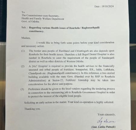 ରଘୁନାଥପଲ୍ଲୀ ଓ ରାଉରକେଲା ଅଂଚଳର ବିଭିନ୍ନ ସ୍ଵାସ୍ଥ୍ୟ ସମସ୍ୟା ଉପରେ ସ୍ଵାସ୍ଥ୍ୟ ଓ ପରିବାର କଲ୍ୟାଣ କମିଶନର କମ୍ ସଚିବଙ୍କୁ ପତ୍ର