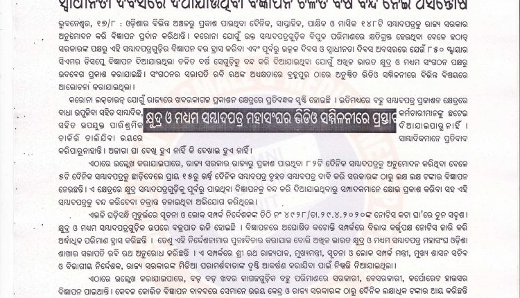 ରାଜ୍ୟ ସରକାରଙ୍କ ପକ୍ଷରୁ କ୍ଷୁଦ୍ର ଓ ମଧ୍ୟମ ସମ୍ବାଦପତ୍ରଗୁଡ଼ିକୁ ଉତ୍କଳ ଦିବସ, ସ୍ୱାଧୀନତା ଦିବସରେ ଦିଆଯାଉଥିବା ବିଜ୍ଞାପନ ଚଳିତ ବର୍ଷ ବନ୍ଦ ନେଇ ଅସନ୍ତୋଷ