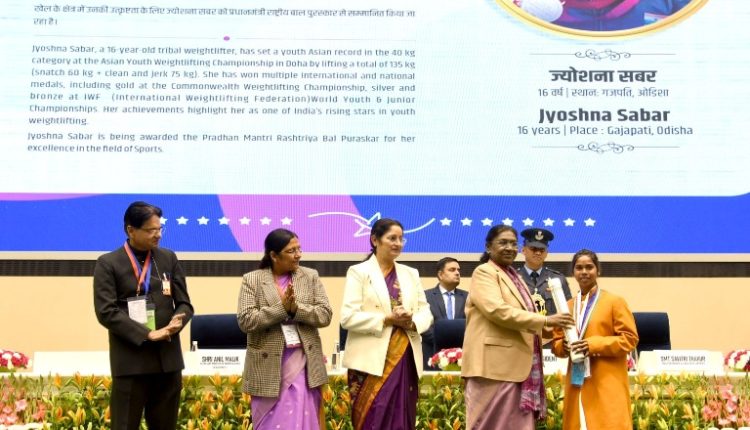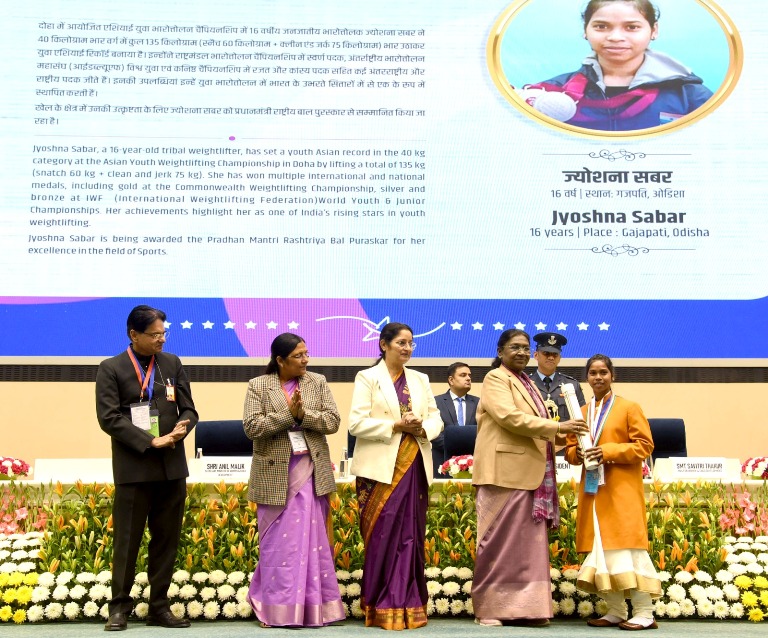 ନୂଆଦିଲ୍ଲୀ, (ପିଆଇବି) : ବିଭିନ୍ନ କ୍ଷେତ୍ରରେ ଉଲ୍ଲେଖନୀୟ ସଫଳତା ହାସଲ କରିଥିବା ପିଲାମାନଙ୍କୁ ରାଷ୍ଟ୍ରପତି ଦ୍ରୌପଦୀ ମୁର୍ମୁ ଆଜି ନୂଆଦିଲ୍ଲୀରେ ପ୍ରଧାନମନ୍ତ୍ରୀ ରାଷ୍ଟ୍ରୀୟ ବାଲ ପୁରସ୍କାର ପ୍ରଦାନ କରିଛନ୍ତି । ଓଡ଼ିଶାର କିଶୋରୀ ଜନଜାତୀୟ କ୍ରୀଡ଼ାବିତ୍ ଜ୍ୟୋତ୍ସ୍ନା ଶବର ଏହି ପୁରସ୍କାର ପାଇ ରାଜ୍ୟର ଗୌରବ ବଢ଼ାଇଛନ୍ତି । ଜ୍ୟୋତ୍ସ୍ନା ଜାତୀୟ ଏବଂ ଅନ୍ତର୍ଜାତୀୟ ସ୍ତରରେ ଅନେକ ସଫଳତା ହାସଲ କରିଛନ୍ତି। ଦୋହାରେ ଆୟୋଜିତ ଏସୀୟ ଯୁବ ଭାରୋତ୍ତୋଳନ ଚାମ୍ପିଅନସିପରେ ୧୬ ବର୍ଷୀୟ ଜନଜାତୀୟ ଭାରୋତ୍ତୋଳନ ପ୍ରତିଯୋଗୀ ଜ୍ୟୋତ୍ସ୍ନା ଶବର ୪୦ କିଲୋଗ୍ରାମ ଓଜନ ବର୍ଗରେ ମୋଟ୍ ୧୩୫ କିଲୋଗ୍ରାମ (ସ୍ନାଚ୍ ୬୦ କିଲୋଗ୍ରାମ+ କ୍ଲିନ୍ ଆଣ୍ଡ ଜର୍କ ୭୫ କିଲୋଗ୍ରାମ) ଭାରୋତ୍ତୋଳନ କରି ଯୁବ ଏସୀୟ ରେକର୍ଡ କରିଥିଲେ। ସେ ରାଜ୍ୟଗୋଷ୍ଠୀ ଭାରୋତ୍ତୋଳନ ଚାମ୍ପିଅନସିପରେ ସ୍ୱର୍ଣ୍ଣ ପଦକ, ଅନ୍ତର୍ଜାତୀୟ ଭାରୋତ୍ତୋଳନ ମହାସଂଘ (ଆଇଡବ୍ଲୁଏଫ) ବିଶ୍ୱ ଯୁବ ଏବଂ କନିଷ୍ଠ ଚାମ୍ପିଅନସିପରେ ରୌପ୍ୟ ଏବଂ କାଂସ୍ୟ ପଦକ ସମେତ ଅନେକ ସଫଳତା ମଧ୍ୟ ପାଇଛନ୍ତି। ତାଙ୍କର ଉପଲବ୍ଧି ତାଙ୍କୁ ଯୁବ ଭାରୋତ୍ତୋଳନ କ୍ଷେତ୍ରରେ ଭାରତର ଉଦୀୟମାନ ତାରକା ମଧ୍ୟରୁ ଅନ୍ୟତମ କରିପାରିଛି। କ୍ରୀଡ଼ା କ୍ଷେତ୍ରରେ ତାଙ୍କର ଉତ୍କର୍ଷତା ଲାଗି ଜ୍ୟୋତ୍ସ୍ନା ଶବରଙ୍କୁ ମର୍ଯ୍ୟାଦାଜନକ ପ୍ରଧାନମନ୍ତ୍ରୀ ରାଷ୍ଟ୍ରୀୟ ବାଲ୍ ପୁରସ୍କାରରେ ସମ୍ମାନିତ କରାଯାଇଛି ।
