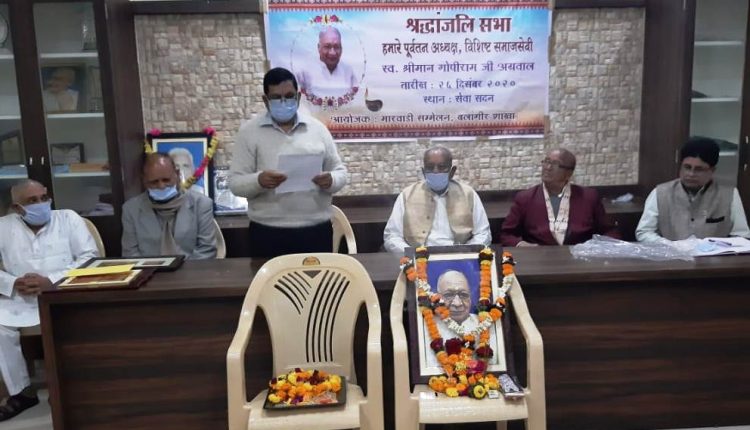 ବଲାଙ୍ଗିର, (କେପିଏନ୍ଏସ୍): ବରିଷ୍ଠ ଆଇନଜୀବୀ, ସମାଜ ସେବୀ ସ୍ୱର୍ଗତ ଗୋପୀରାମ ଅଗ୍ରୱାଲଙ୍କ ଗତ ୧୯ ତାରିଖରେ ସ୍ୱର୍ଗବାସ ହୋଇଥିଲା । ସେ ଅଂଚଳର ଜଣେ ଜଣାଶୁଣା ସମାଜସେବୀ ଥିଲେ । ଆଜି ବଲାଙ୍ଗିର ସହରର ସେବା ସଦନ ପରିସରରେ ତାଙ୍କ ସ୍ମୃତି ଚାରଣ ପାଇଁ ଏକ ଶ୍ରଦ୍ଧାଞ୍ଜଳି ସଭାର ଆୟୋଜନ ମାରୱାଡି ସମ୍ବେଳନର ଅଧ୍ୟକ୍ଷ ମହେନ୍ଦ୍ର ଅଗ୍ରୱାଲଙ୍କ ସଭାପତିତ୍ୱରେ ଅନୁଷ୍ଠିତ ହୋଇଥିଲ । ଏହି ଅବସରରେ ସ୍ୱର୍ଗତ ଗୋପୀରାମ ଅଗ୍ରୱାଲଙ୍କୁ ମରୋଣତ୍ତର ସମାଜ ଗୌରବରେ ସମ୍ମାନିତ କରାଯାଇଥିଲା । ନାଗରିକ କମିଟିର ସଭାପତି ବିକ୍ରମ ବହିଦାର, ମାରୱାଡି ପଞ୍ଚାୟତ ସଭାପତି ପ୍ରକାଶ ଅଗ୍ରୱାଲ, ସମାଜ ସେବୀ ଇଂ ମଗନଲାଲ ଅଗ୍ରୱାଲ, ସ୍ୱର୍ଗତ ଗୋପୀବ ବାବୁଙ୍କ ପୁଅ ଦିନ ଦୟାଲ ଅଗ୍ରୱାଲ ମଞ୍ଚାସୀନ ଥିଲେ । ସଭାକୁ ପରିଚାଳନା କରିଥିଲେ ମାରୱାଡି ସମ୍ବେଳନର ସଂପାଦକ ମୋହନ ଅଗ୍ରୱାଲ । ସ୍ୱର୍ଗତ ଗୋପୀରାମ ଅଗ୍ରୱାଲଙ୍କ ଚିତ୍ରରେ ପୁଷ୍ପାଞ୍ଜଳୀ ଅର୍ପଣ ସହିତ ବିଭିନ୍ନ ବକ୍ତାମାନେ ଗୋପୀରାମଙ୍କ ରାଷ୍ଟ୍ର ଏବଂ ସମାଜ ପ୍ରତି ଅବଦାନକୁ ମନେପକାଇ ଥିଲେ । ଏହି ଅବସରରେ ନାଗରିକ କମିଟି ସମ୍ପାଦକ ବିଷ୍ଣୁପ୍ରସଦା କେଡିଆ, ଗୌରିଶଙ୍କର ଅଗ୍ରୱାଲ, ମନୋଜ ଜୈନ, ସଞ୍ଜୟ ଅଗ୍ରୱାଲ, ଗଜାନନ ଅଗ୍ରୱାଲ, ସମୀର ଅଗ୍ରୱାଲ, କୈଳାସ ଅଗ୍ରୱାଲ, ନନ୍ଦ କିଶୋର ଅଗ୍ରୱାଲ, ବାବୁଲାଲ ଖେଡିଆ, ରାଦେଶ ଅଗ୍ରୱାଲଙ୍କ ସହିତ ବହୁ ସଂଖ୍ୟାରେ ସଦସ୍ୟ ଗଣ ଉପସ୍ଥିତ ଥିଲେ । ଗୋପୀବାବୁଙ୍କ ଛୋଟ ଭାଇ ଶୁଶିଲ ଅଗ୍ରୱାଲ, କୋଲ୍ଡି ଅଗ୍ରୱାଲ ସମସ୍ତଙ୍କୁ ଧନ୍ୟବାଦ ଅର୍ପଣ କରିଥିଲେ ।