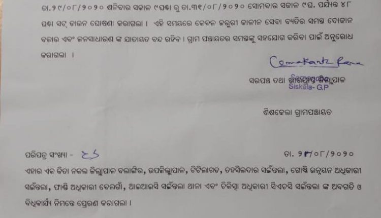 ସଇଁନ୍ତଳା, (ଅଜିତ କୂମାର ସାହୁ) :ବଲାଙ୍ଗିର ଜିଲ୍ଲା ସଇଁନ୍ତଳା ବ୍ଳକ ଶିଷକେଲା ଗ୍ରାମରେ ୨ଜଣ କରୋନା ସଂକ୍ରମିତ ଚିହ୍ନଟ ହେବାପରେ ଶିଷକେଲା ସରପଞ୍ଚ ଉମାକାନ୍ତ ରଣା ଉକ୍ତ ଗ୍ରାମକୁ ୪୮ ଘଣ୍ଟା ପାଇଁ ସଟଡାଉନ କରିଛନ୍ତି।ଏଥିରେ ଜରୁରୀ କାଳୀନ ସେବା ବ୍ୟତୀତ ଅନ୍ୟ ସବୁ ଦୋକାନ ବଜାର ଏବଂ ଜନସାଧାରଣ ଙ୍କ ଯାତାୟତ କୁ ବନ୍ଦ କରାଯାଇଛି।ଜାରି ହୋଇଥିବା ସମସ୍ତ ନିୟମ କୁ ମାନିବା ପାଇଁ ସେ ସମସ୍ତ ଙ୍କୁ ଅନୁରୋଧ କରିଛନ୍ତି।